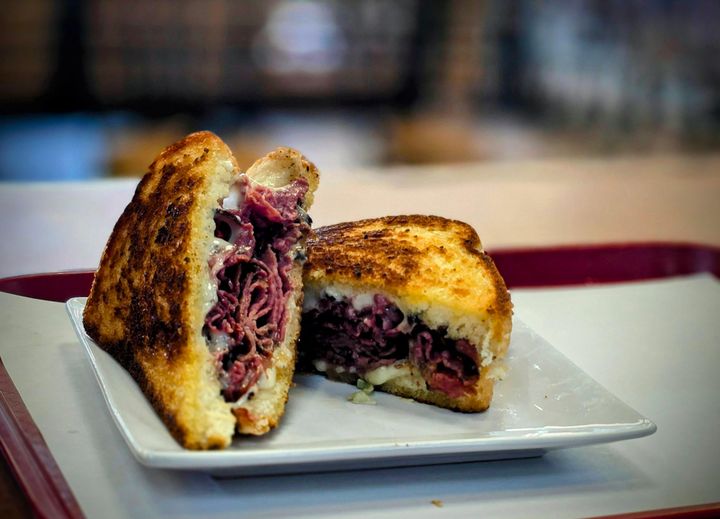 Generous portion of our hot savory pastrami stack on thick-cut Texas Toast, layered with Swiss cheese and a hint of mayo.